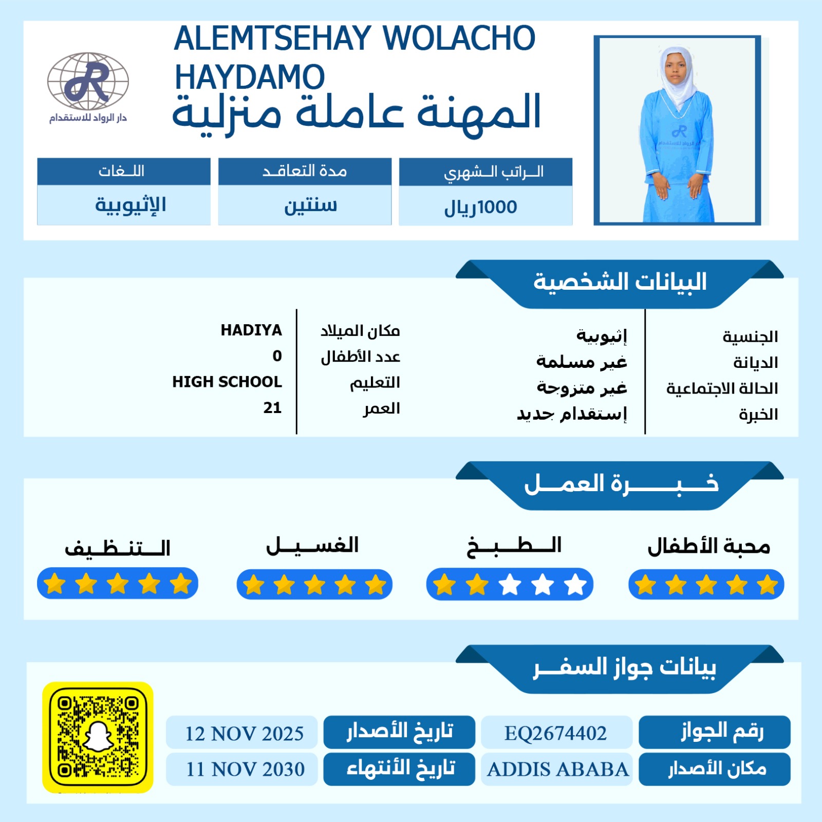 عاملة منزلية اثيوبية تجيد التنظيف والغسيل والكوي وجميع مهام المنزل تمتاز بقدرتها الكبيرة على الفهم وسرعة التعلم
