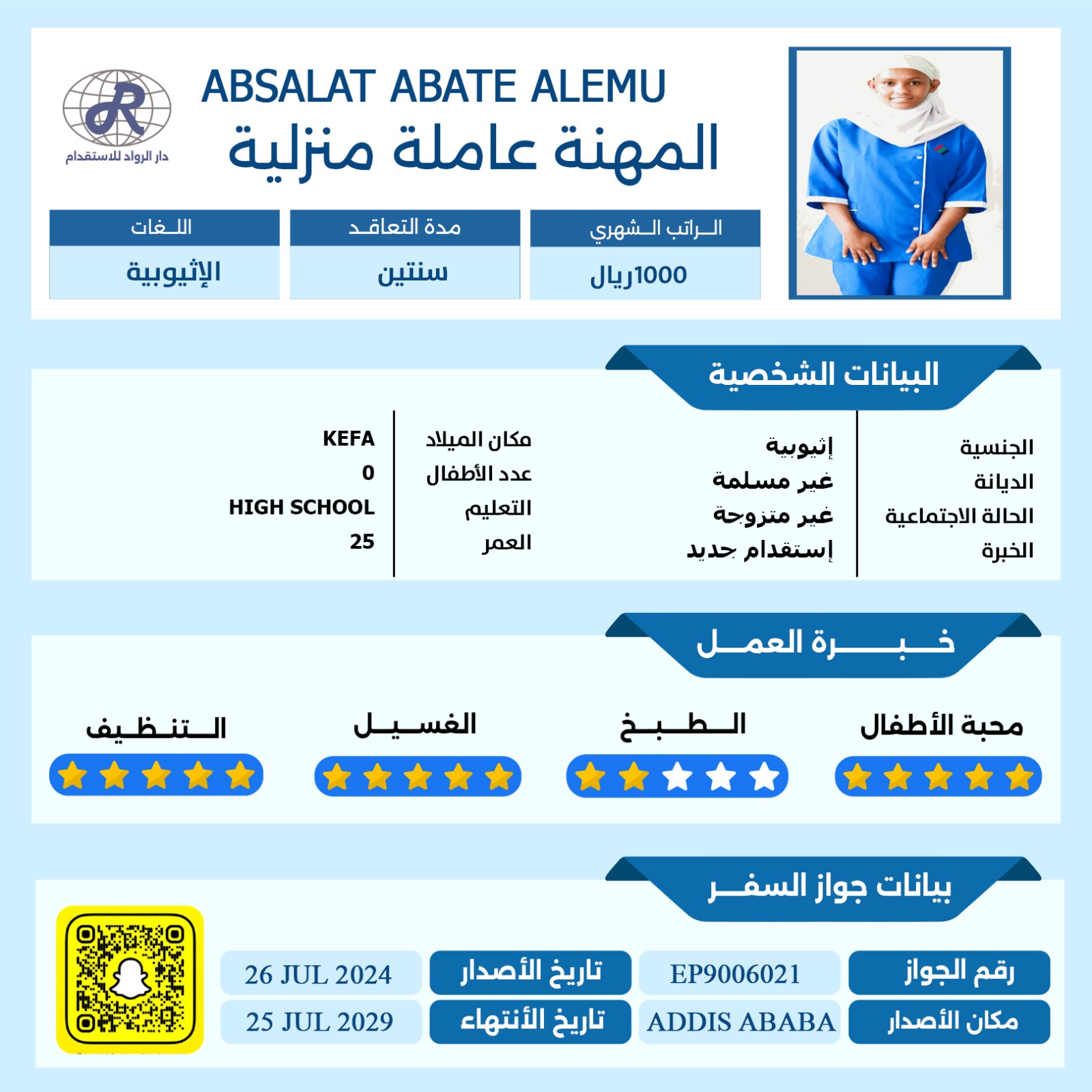 عاملة منزلية اثيوبية تجيد التنظيف والغسيل والكوي وجميع مهام المنزل تمتاز بقدرتها الكبيرة على الفهم وسرعة التعلم