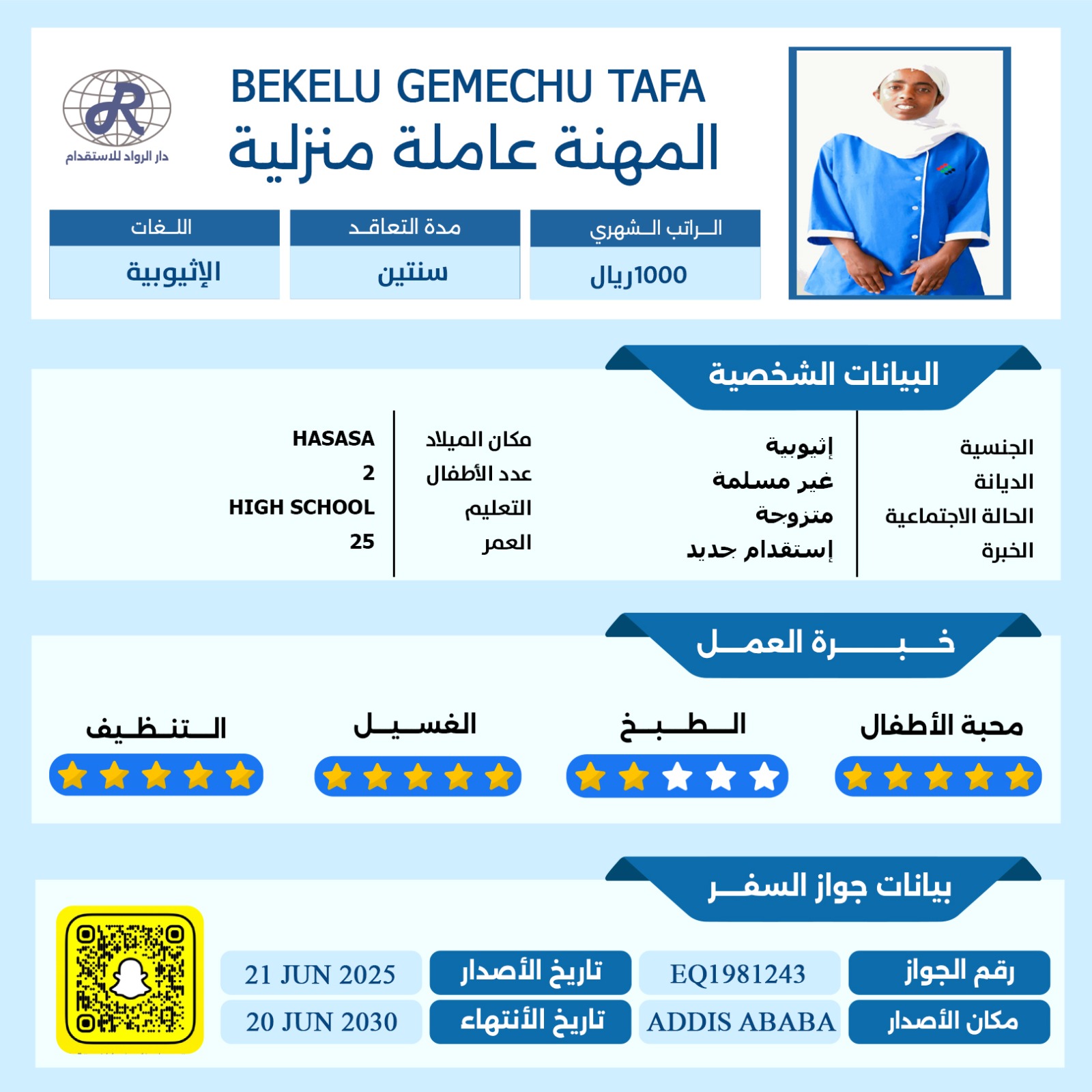 عاملة منزلية اثيوبية تجيد التنظيف والغسيل والكوي وجميع مهام المنزل تمتاز بقدرتها الكبيرة على الفهم وسرعة التعلم