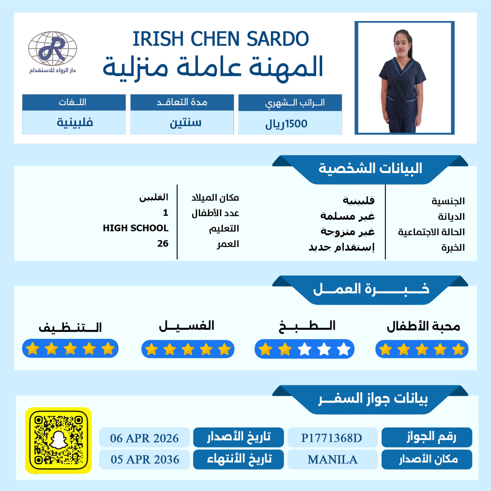 عاملة منزلية فلبينية غير مسلمة تجيد التنظيف والغسيل والكوي وجميع مهام المنزل تمتاز بقدرتها الكبيرة على الفهم وسرعة التعلم