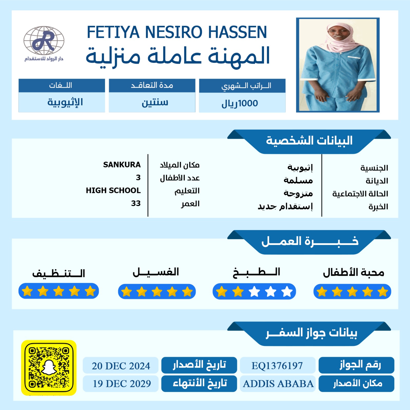 عاملة منزلية اثيوبية تجيد التنظيف والغسيل والكوي وجميع مهام المنزل تمتاز بقدرتها الكبيرة على الفهم وسرعة التعلم