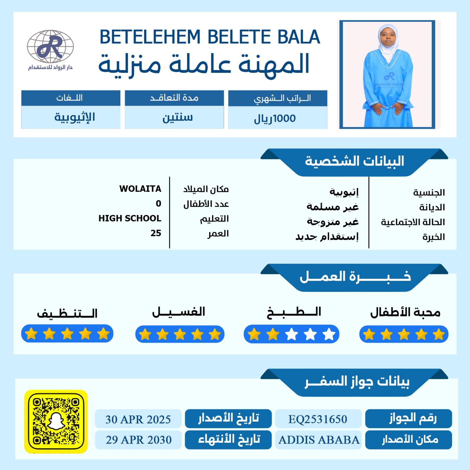 عاملة منزلية اثيوبية تجيد التنظيف والغسيل والكوي وجميع مهام المنزل تمتاز بقدرتها الكبيرة على الفهم وسرعة التعلم