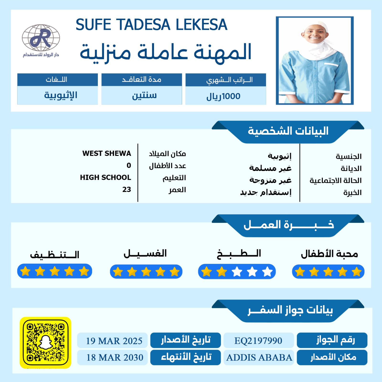 عاملة منزلية اثيوبية تجيد التنظيف والغسيل والكوي وجميع مهام المنزل تمتاز بقدرتها الكبيرة على الفهم وسرعة التعلم