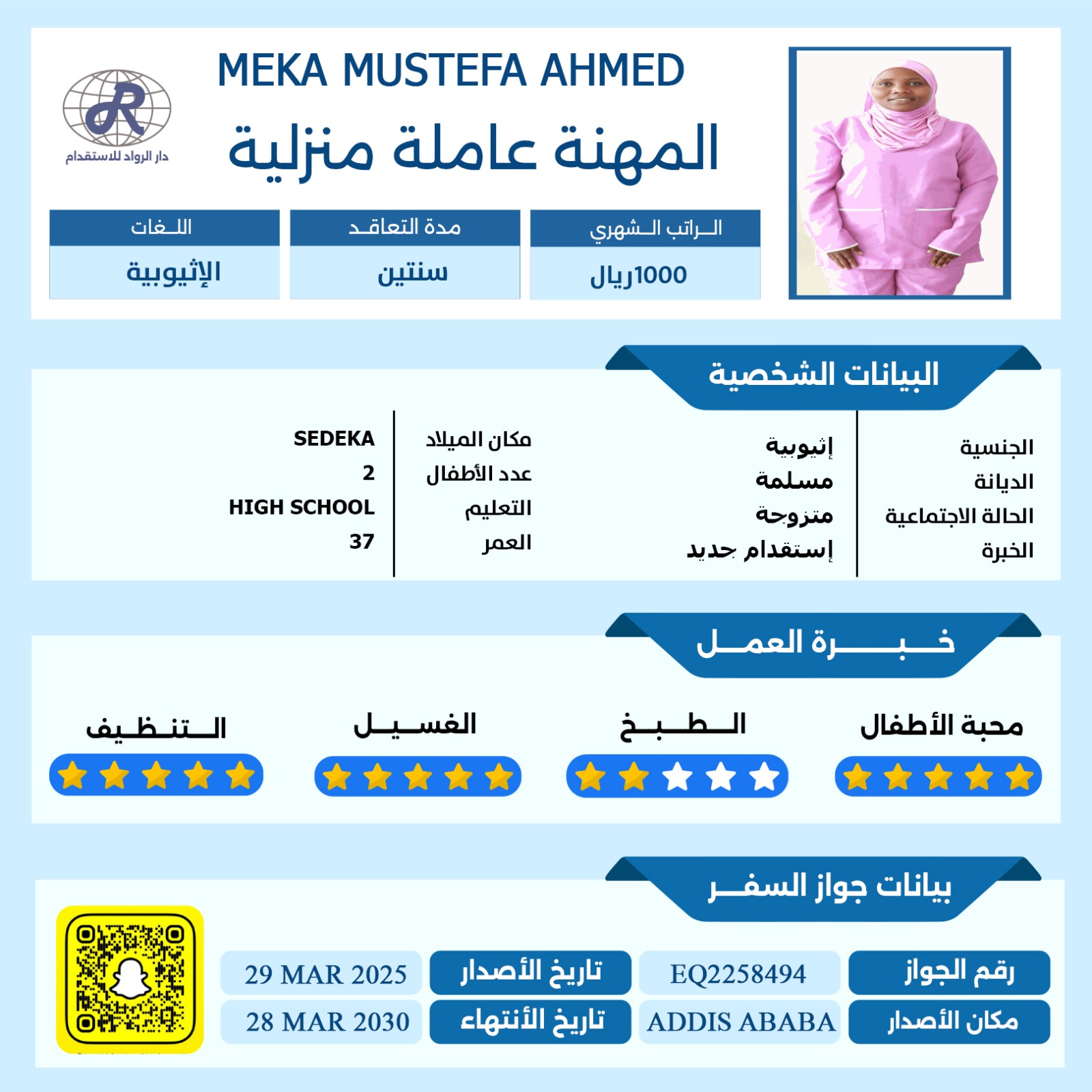 عاملة منزلية اثيوبية تجيد التنظيف والغسيل والكوي وجميع مهام المنزل تمتاز بقدرتها الكبيرة على الفهم وسرعة التعلم