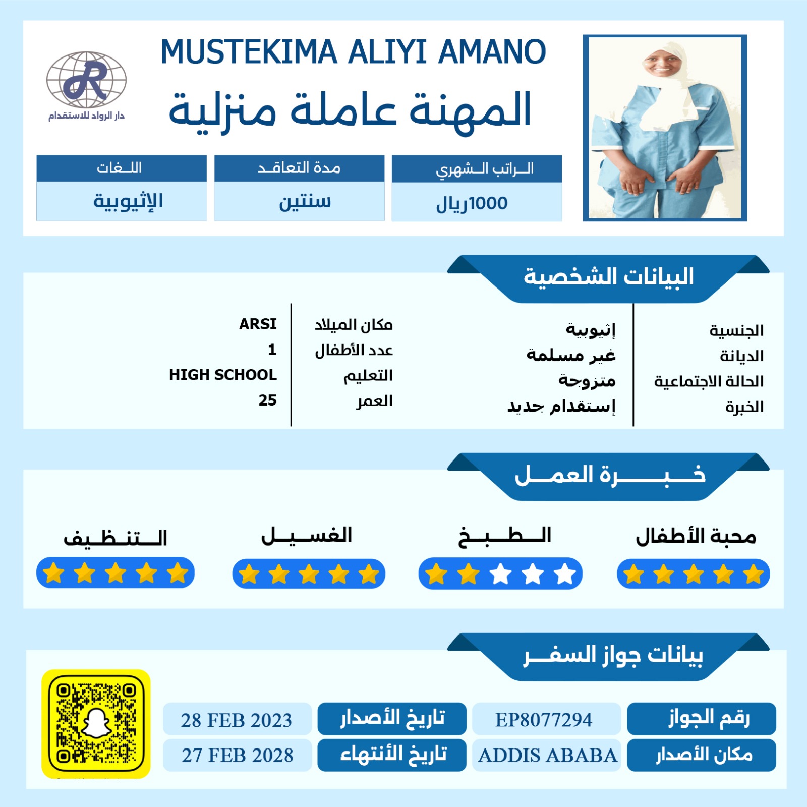 عاملة منزلية اثيوبية تجيد التنظيف والغسيل والكوي وجميع مهام المنزل تمتاز بقدرتها الكبيرة على الفهم وسرعة التعلم